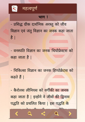 Applikationen har en användarvänlig och vacker design där användarna kan justera textstorleken för bättre läsbarhet. Funktioner inkluderar en frågebank för att läsa frågor och svar, detaljerade anteckningar om olika ämnen, samt en sektion för viktiga fakta. Allt innehåll är tillgängligt på hindi, vilket gör det lättare att förstå och tillämpa kunskapen. Sammanfattningsvis är Biology (जीव विज्ञान) en praktisk resurs för dem som vill fördjupa sig i biologi och förbereda sig för kommande prov.